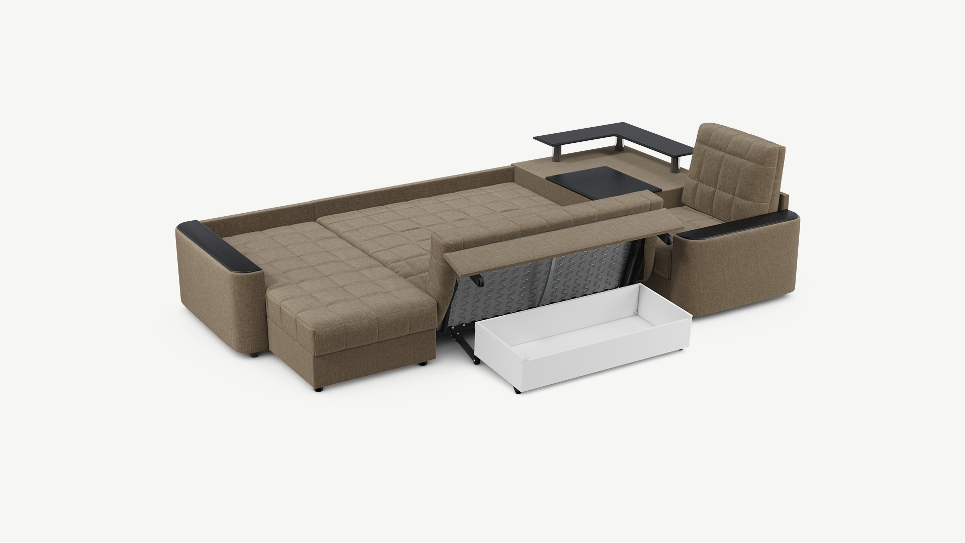 Выбирая угловой диван со столиком, Вы сможете проводить время с максимальным комфортом, многократно повысив функциональность дивана. Все дело в том, что под столешницей модуля расположена вместительная емкость для хранения. Кроме того, поверхность столика — идеальное пространство для чаепития в приятной компании, а также место для множества актуальных мелочей — от ноутбука до косметики.
