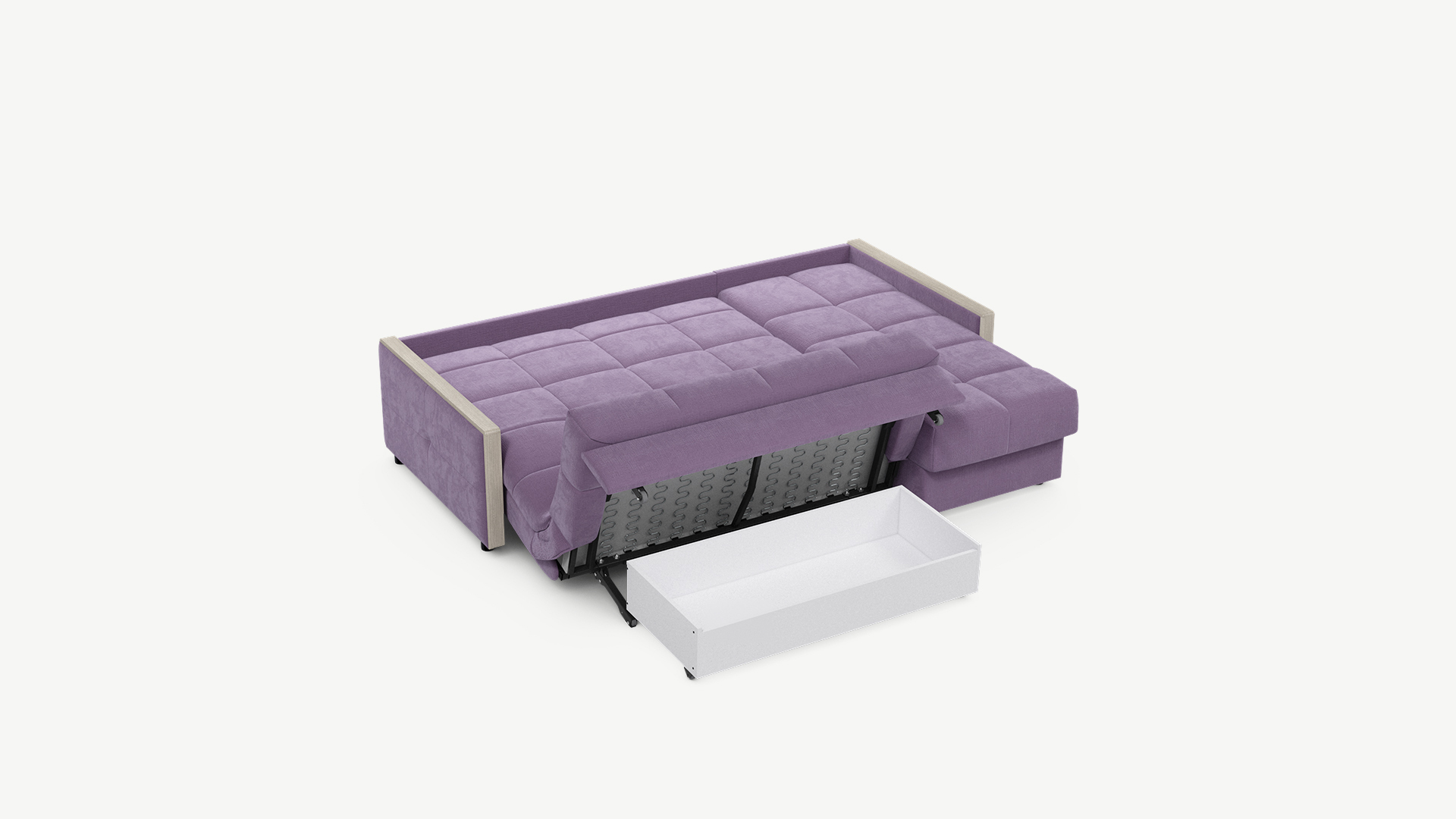 Оттоманка обеспечивает дополнительное пространство для отдыха, благодаря которому Вы можете располагаться с максимальным комфортом, вытянув ноги. Под данной секцией расположен вместительный бельевой короб.