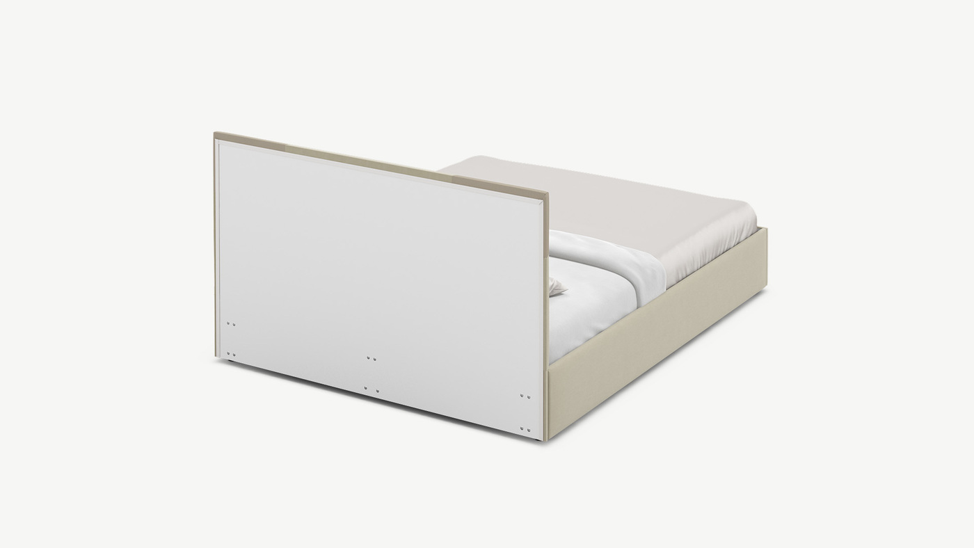 MOON FAMILY 1257 привлекает внимание оригинальным исполнением: широкие полосы ткани эффектно пересекают периметр изголовья, создавая на нем графический орнамент. Элегантным и практичным акцентом служат скрытые карманы, расположенные по его углам. Лаконичные формы объемных царг создают единый гармоничный образ и фокусируют внимание на центральном текстурном элементе кровати.