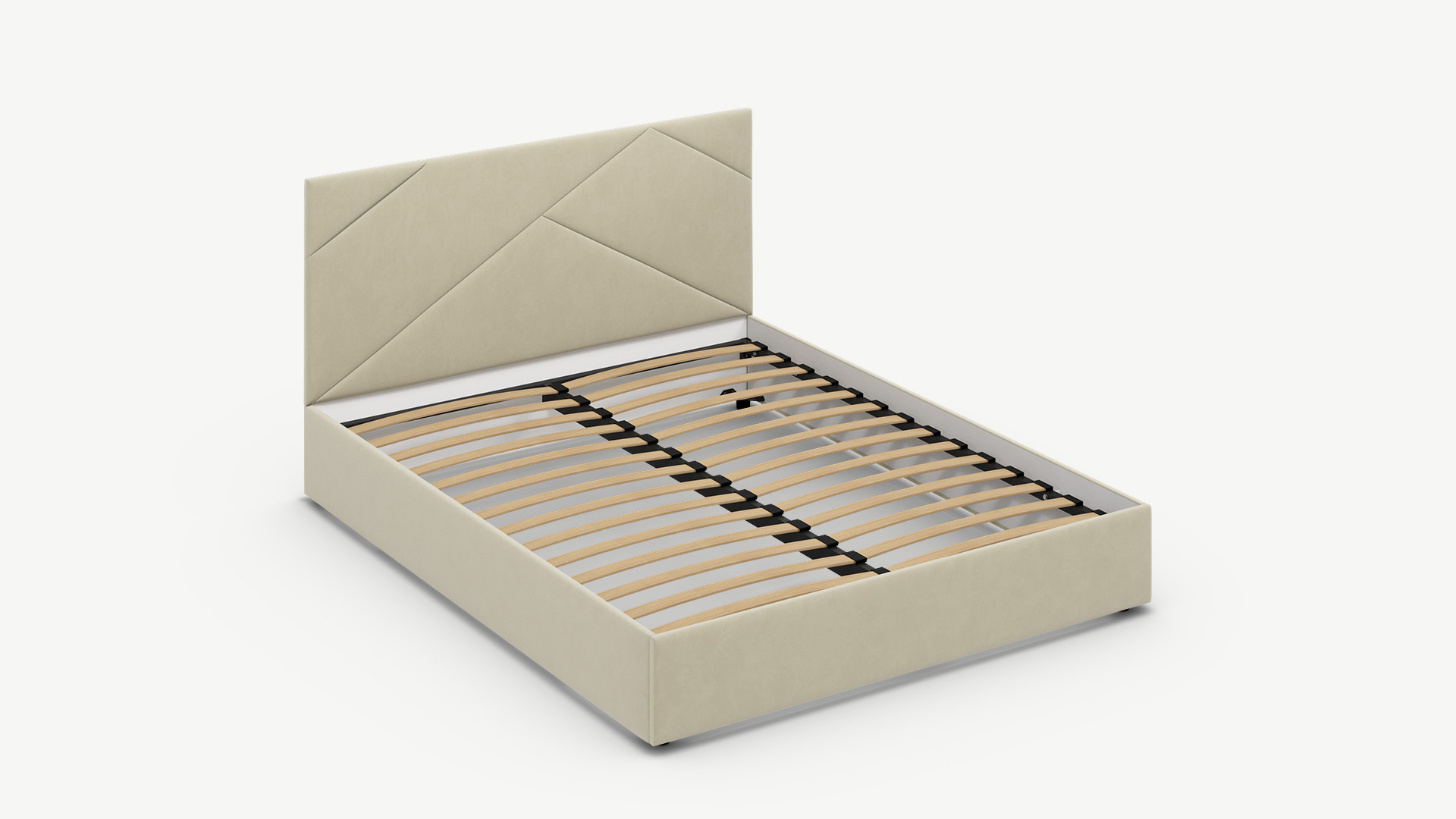 MOON FAMILY 1257 привлекает внимание оригинальным исполнением: широкие полосы ткани эффектно пересекают периметр изголовья, создавая на нем графический орнамент. Элегантным и практичным акцентом служат скрытые карманы, расположенные по его углам. Лаконичные формы объемных царг создают единый гармоничный образ и фокусируют внимание на центральном текстурном элементе кровати.