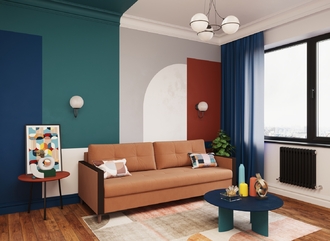 Спинка, выполненная в обивочной ткани, позволяет ставить диван в центре комнаты и зонировать пространство.
