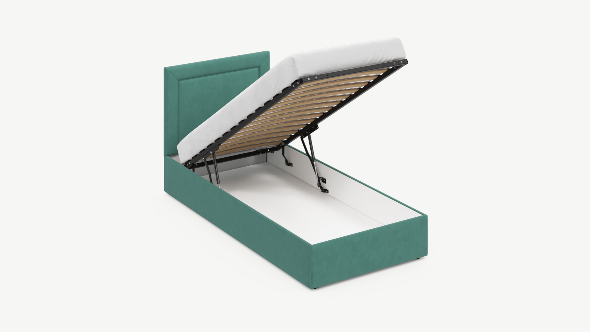 Вместительная емкость под кроватью без внутренних перегородок позволяет использовать для хранения вещей 100% пространства.
