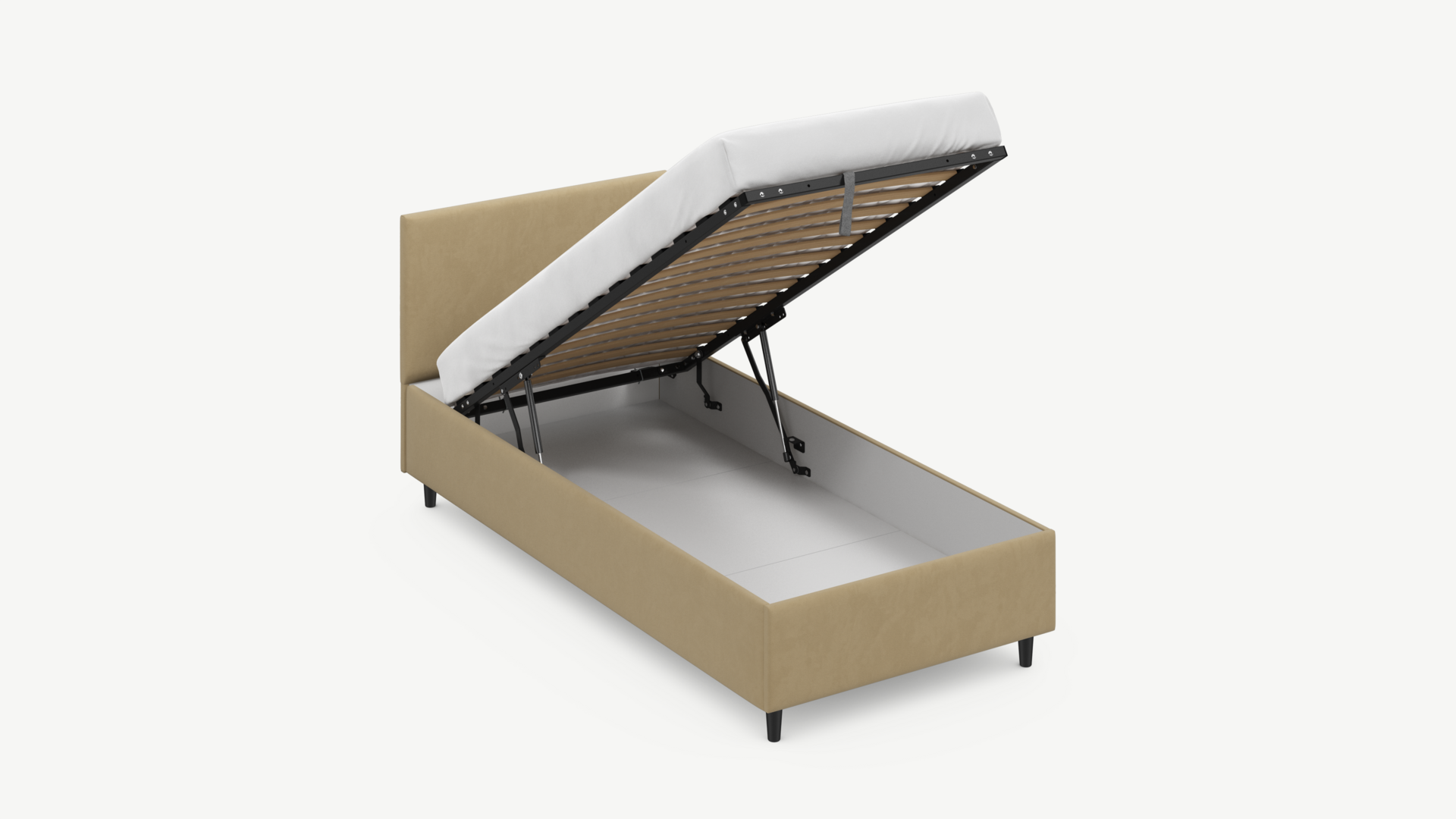 • Скрытая под основанием вместительная емкость без внутренних перегородок позволяет использовать всю площадь подкроватного пространства для хранения вещей.