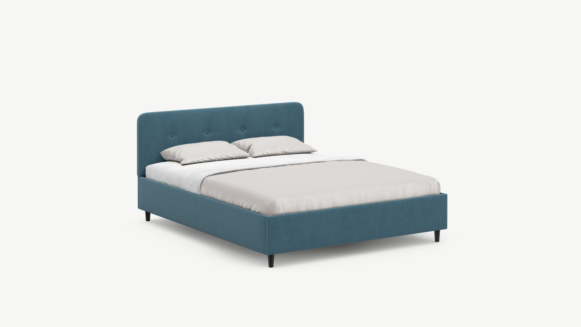 Царга, задающая пропорции, благодаря гладкости своей фактуры подчеркивает центральный элемент декора. Высокие опоры приподнимают фигуру кровати над полом и добавляют её образу визуальной легкости.