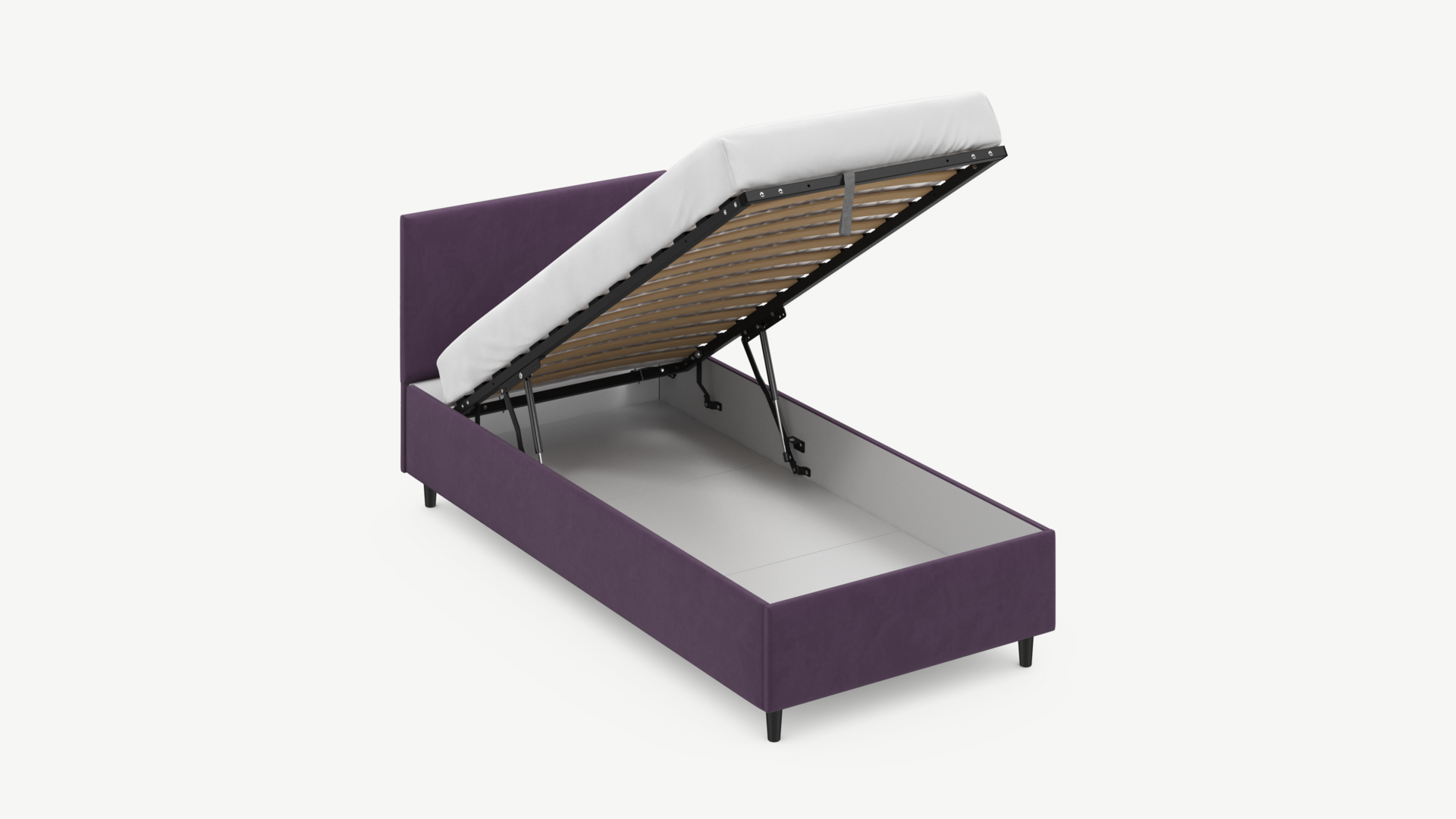 Вместительная емкость под кроватью без внутренних перегородок позволяет использовать для хранения вещей 100% пространства.
