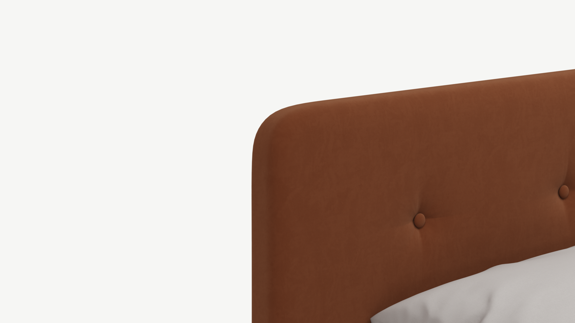Царга, задающая пропорции, благодаря гладкости своей фактуры подчеркивает центральный элемент декора. Высокие опоры приподнимают фигуру кровати над полом и добавляют её образу визуальной легкости.