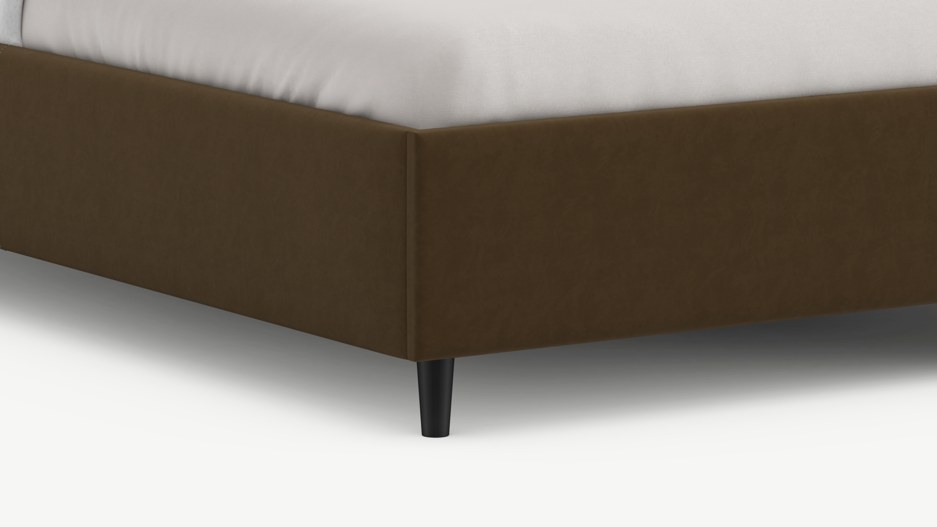 Царга, задающая пропорции, благодаря гладкости своей фактуры подчеркивает центральный элемент декора. Высокие опоры приподнимают фигуру кровати над полом и добавляют её образу визуальной легкости.