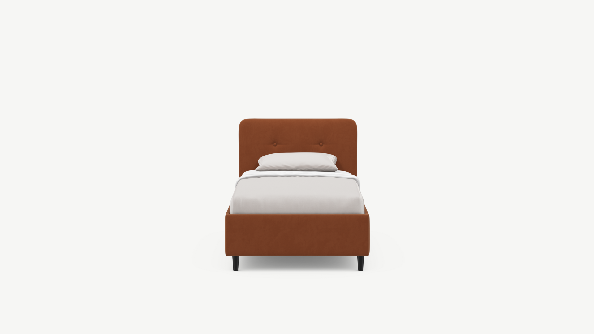 Царга, задающая пропорции, благодаря гладкости своей фактуры подчеркивает центральный элемент декора. Высокие опоры приподнимают фигуру кровати над полом и добавляют её образу визуальной легкости.
