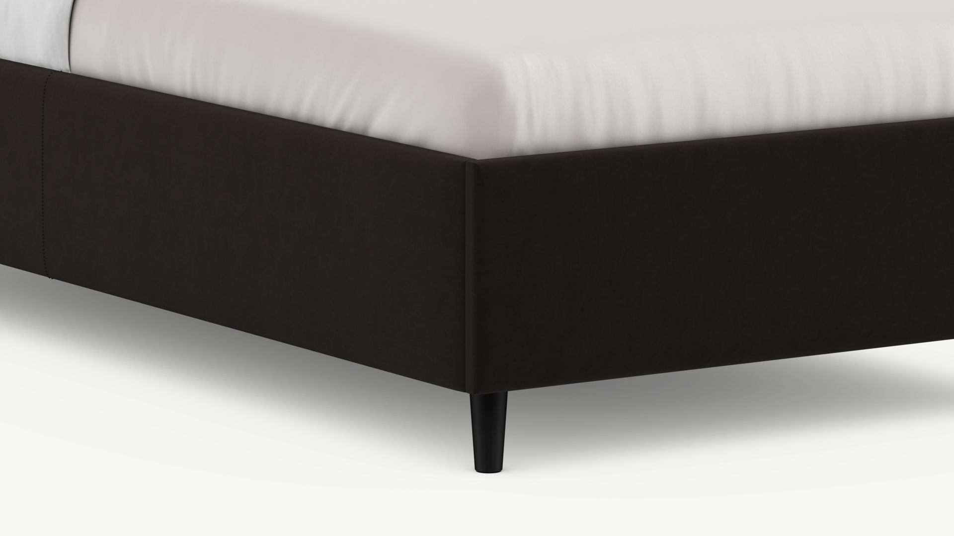 Царга, задающая пропорции, благодаря гладкости своей фактуры подчеркивает центральный элемент декора. Высокие опоры приподнимают фигуру кровати над полом и добавляют её образу визуальной легкости.