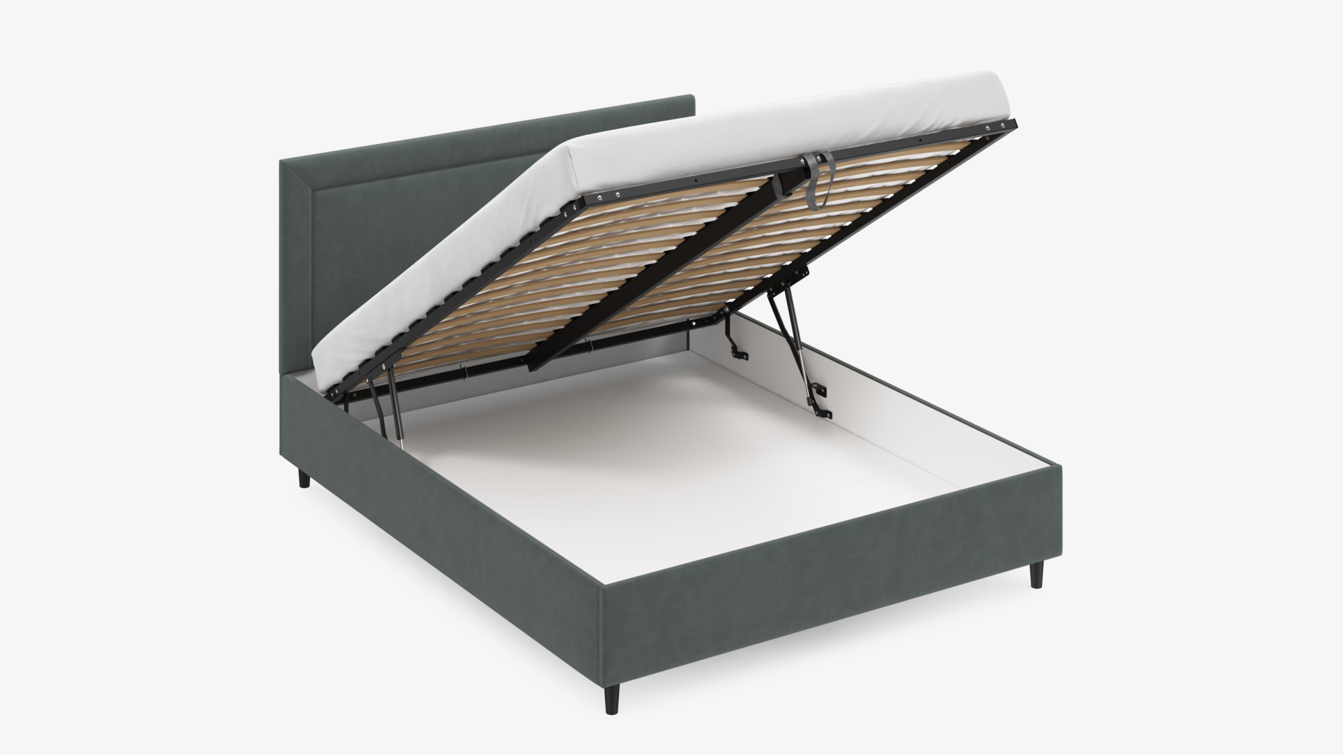 Вместительная емкость под кроватью без внутренних перегородок позволяет использовать для хранения вещей 100% пространства.