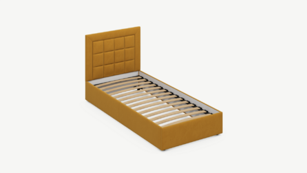 Изголовье декорировано рельефным рисунком стежки в крупный квадрат, получившим особую фактуру за счет глубины шва.