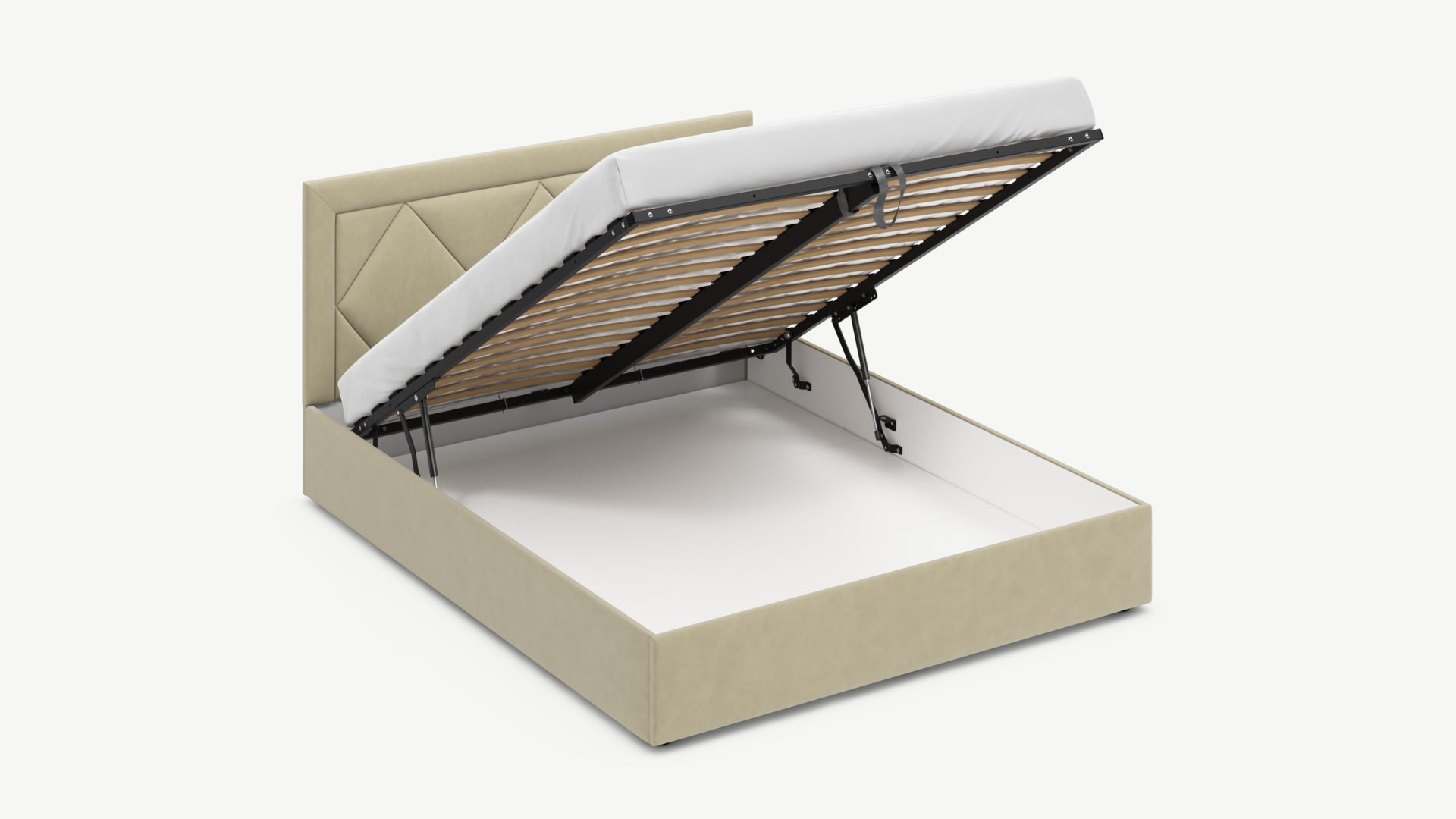 • Скрытая под основанием вместительная емкость без внутренних перегородок позволяет использовать всю площадь подкроватного пространства для хранения вещей.