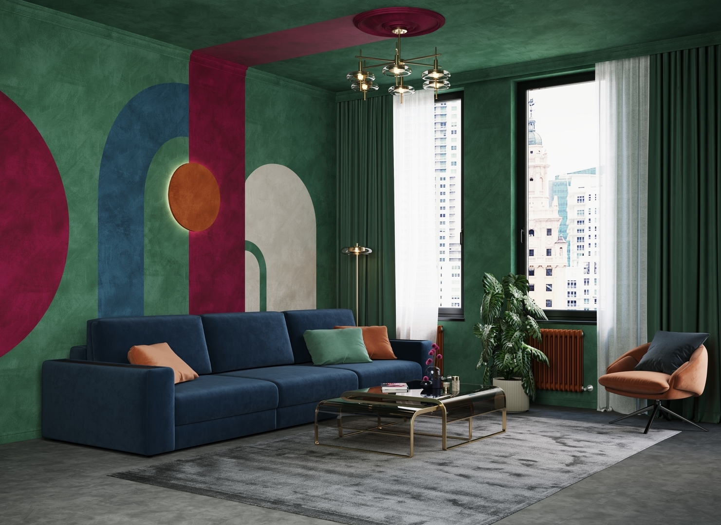 Спинка, выполненная в обивочной ткани, позволяет ставить диван в центре комнаты и зонировать пространство.