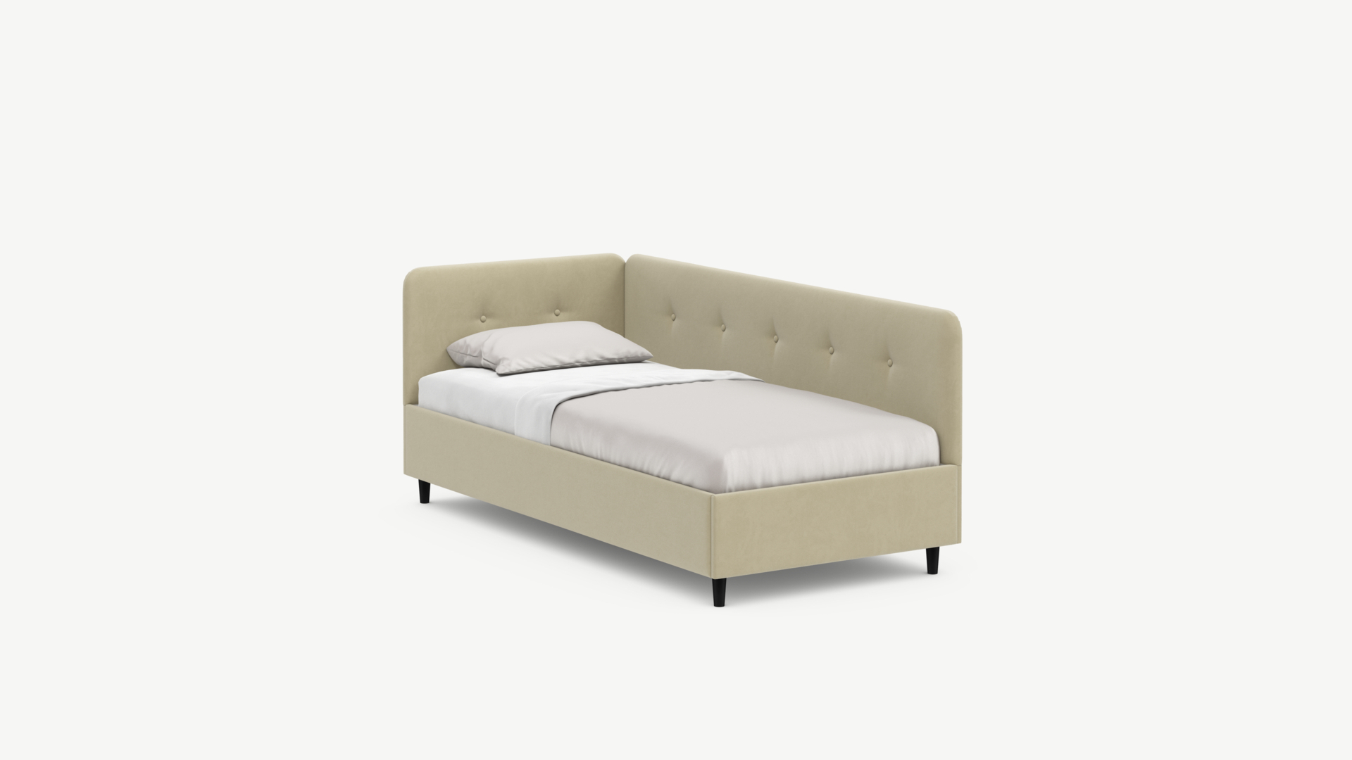 Угловая односпальная кровать MOON FAMILY 1253 с мягкой спинкой и изголовьем обладает округлыми формами, привносящими в интерьер нотки нежности. Изголовье, украшенное пуговицами, добавляет окружающему пространству шарм и уют. Высокие опоры придают кровати визуальной легкости, а также обеспечивают удобство во время уборки.