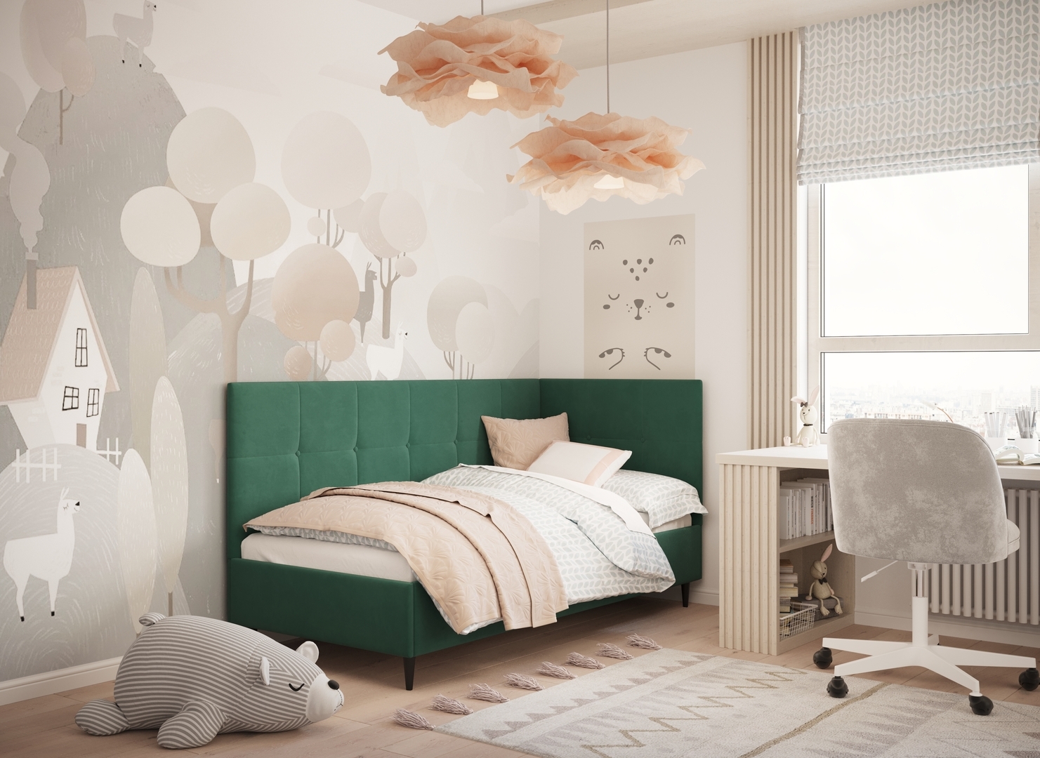 Угловая односпальная кровать MOON FAMILY 1261 с мягкой спинкой и изголовьем создаст в Вашей спальне ощущение уюта. Крупная квадратная стежка привносит в интерьер графических акцентов, а вставка из пуговиц наполняет пространство ощущением домашнего тепла.