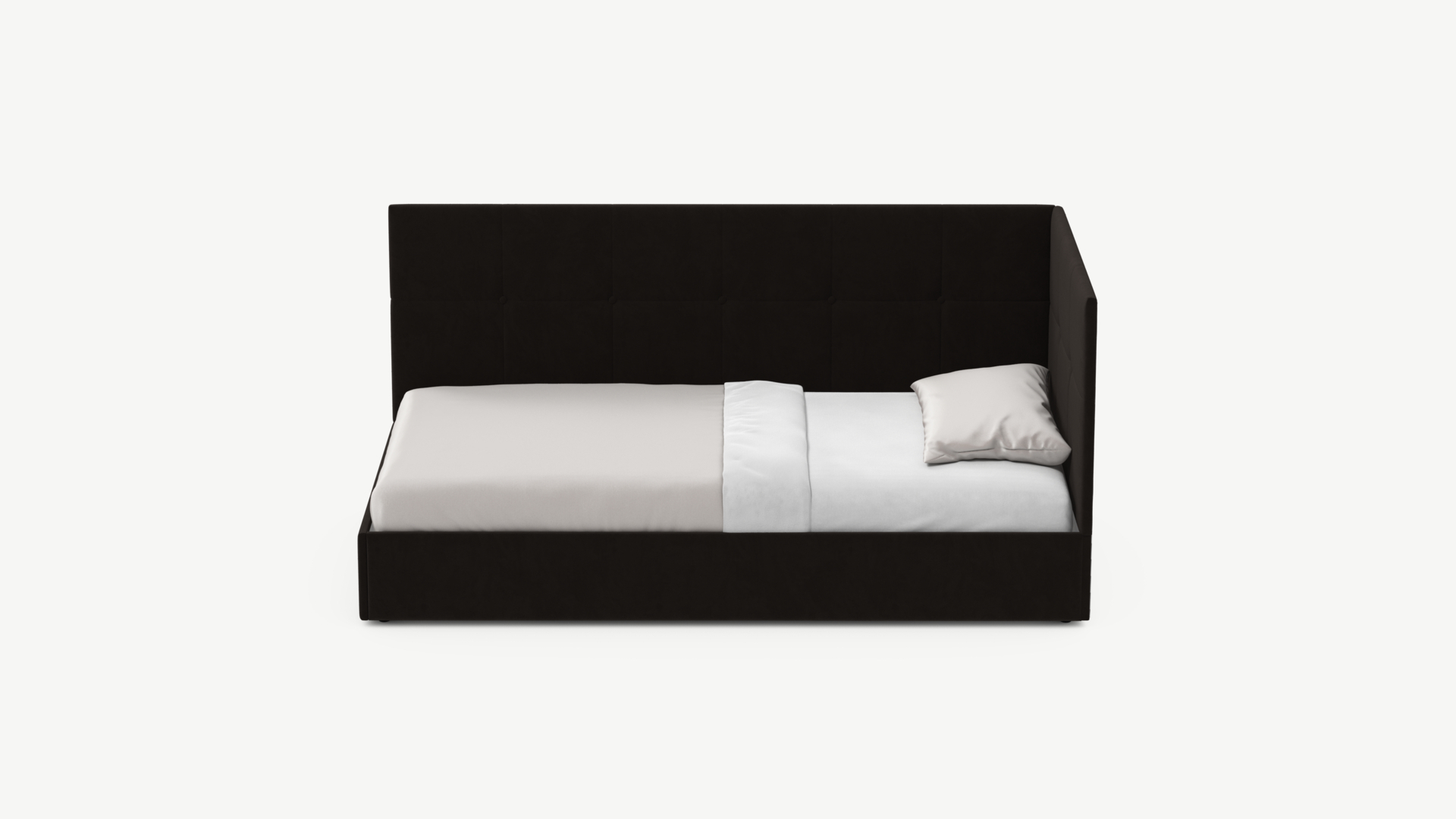 Угловая односпальная кровать MOON FAMILY 1261 с мягкой спинкой и изголовьем создаст в Вашей спальне ощущение уюта. Крупная квадратная стежка привносит в интерьер графических акцентов, а вставка из пуговиц наполняет пространство ощущением домашнего тепла.