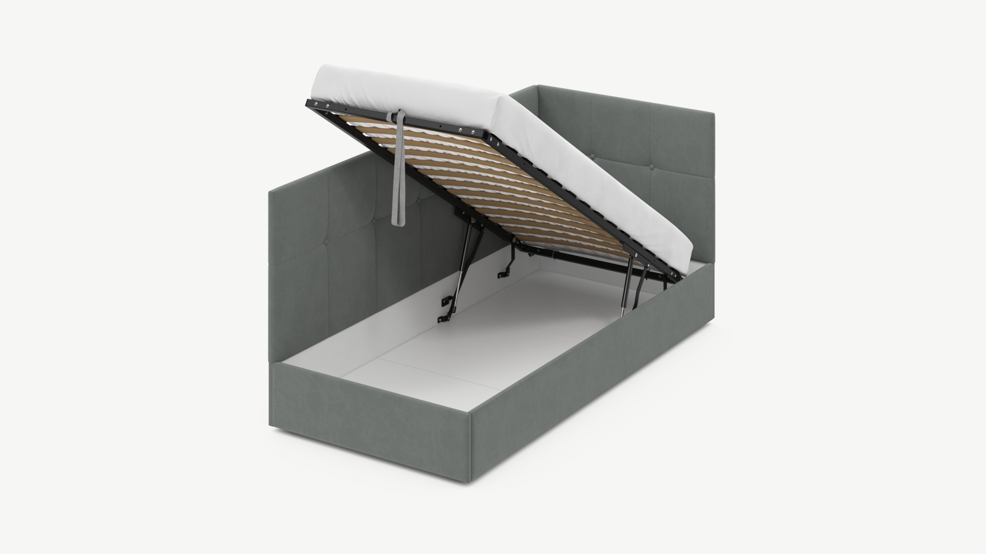• Скрытая под основанием вместительная емкость без внутренних перегородок позволяет использовать всю площадь подкроватного пространства для хранения вещей.