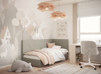 Угловая односпальная кровать MOON FAMILY 1261 с мягкой спинкой и изголовьем создаст в Вашей спальне ощущение уюта. Крупная квадратная стежка привносит в интерьер графических акцентов, а вставка из пуговиц наполняет пространство ощущением домашнего тепла.