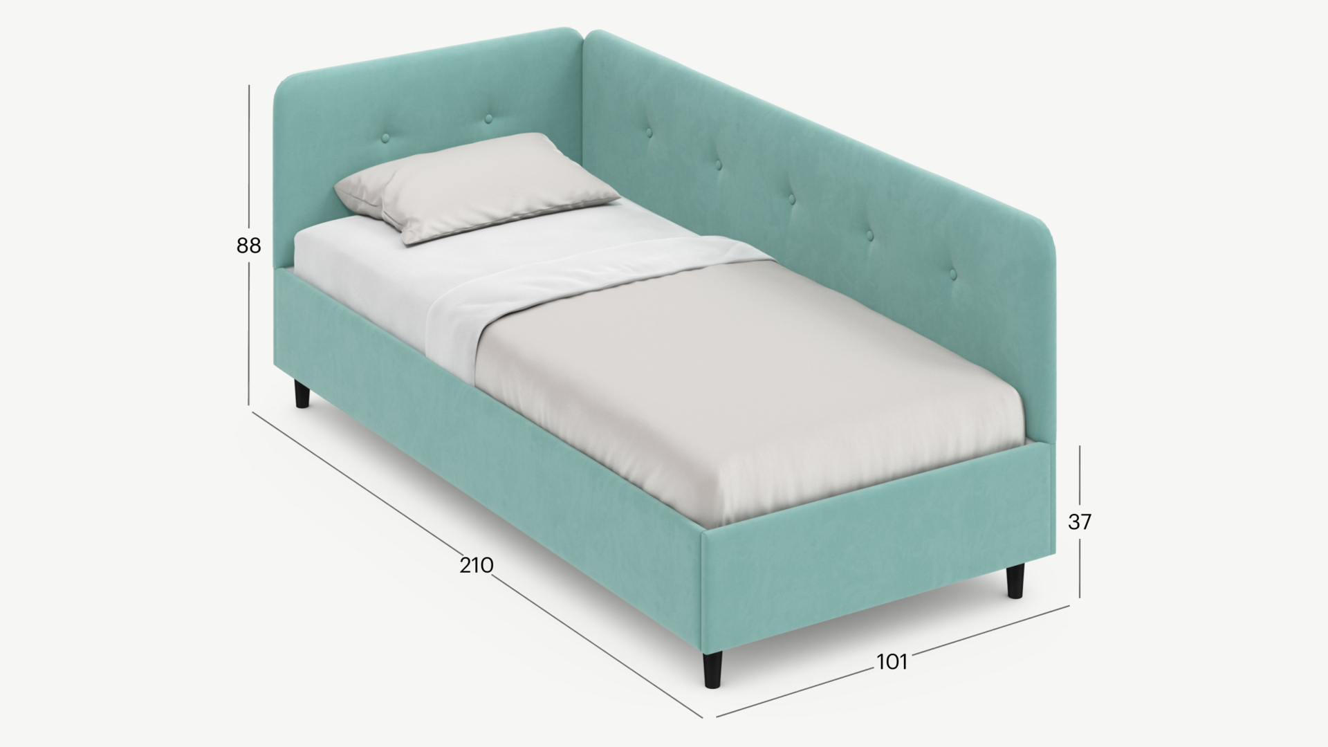 Угловая односпальная кровать MOON FAMILY 1253 с мягкой спинкой и изголовьем обладает округлыми формами, привносящими в интерьер нотки нежности. Изголовье, украшенное пуговицами, добавляет окружающему пространству шарм и уют. Высокие опоры придают кровати визуальной легкости, а также обеспечивают удобство во время уборки.