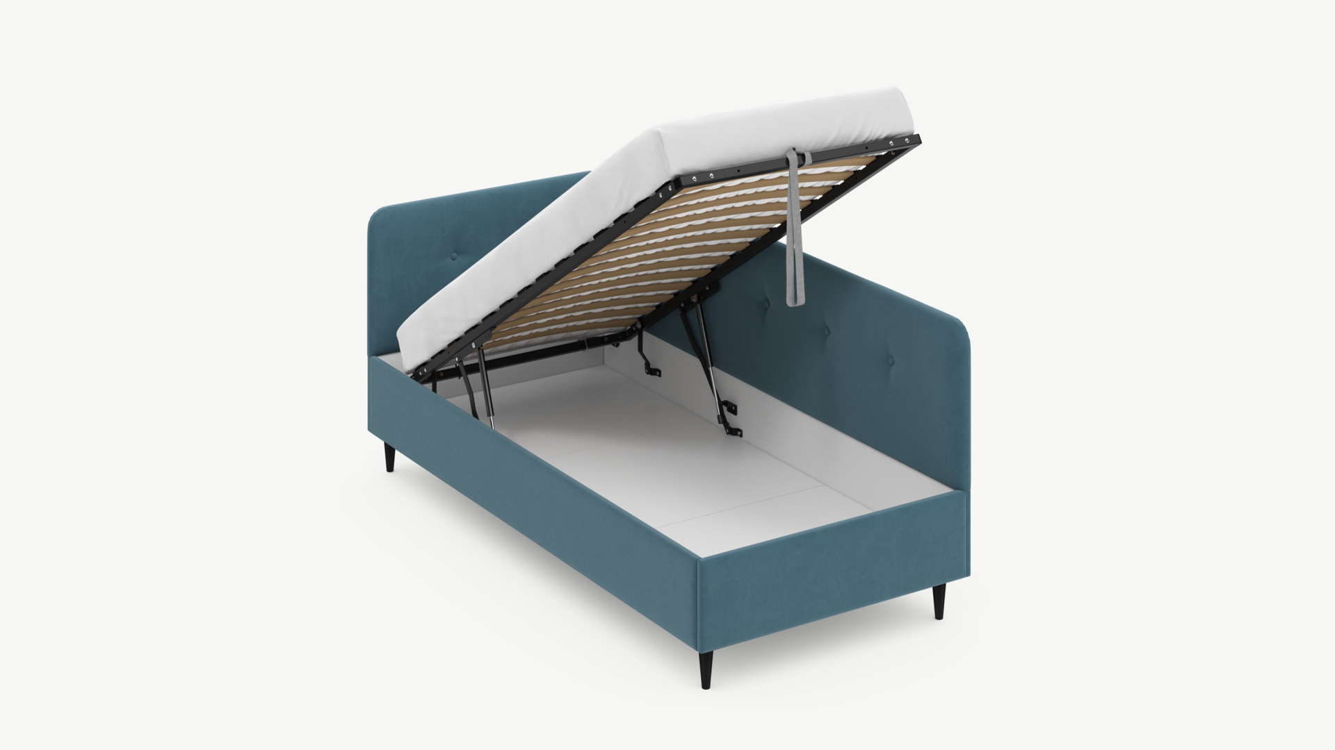 - Скрытая под основанием вместительная емкость без внутренних перегородок позволяет использовать всю площадь подкроватного пространства для хранения вещей.