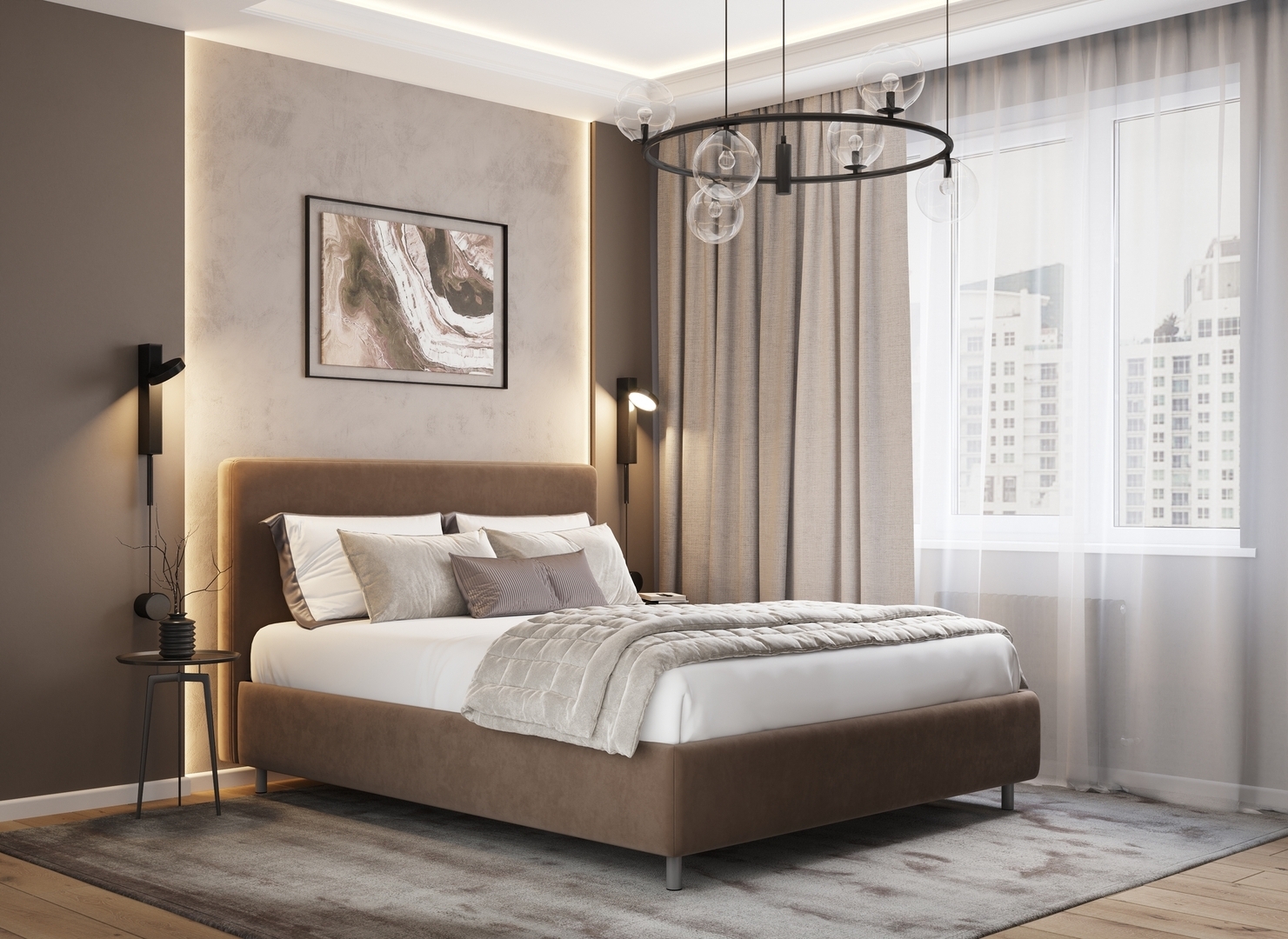 Творческий подход к выбору обивочного материала меняет образ дизайна. Велюр за счет своей бархатистой фактуры привносит в пространство шика и утонченности. Шенилл дополняет оформление спальни природными текстурами, создавая атмосферу тепла и уюта.