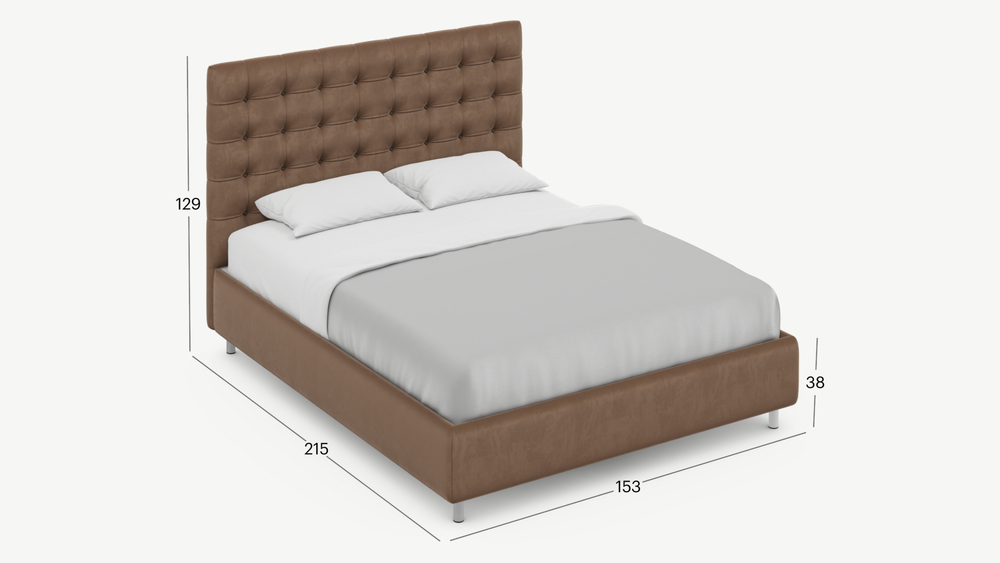 Дизайн MOON 1155 излучает обаяние и роскошь. Центральный элемент кровати, оформленный каретной стяжкой, безупречно сочетается с лаконичной геометрией царг, создавая впечатляющий рельеф. Изголовье респектабельно воплощает идею аристократической элегантности: просыпайтесь и засыпайте, подобно монаршим особам!