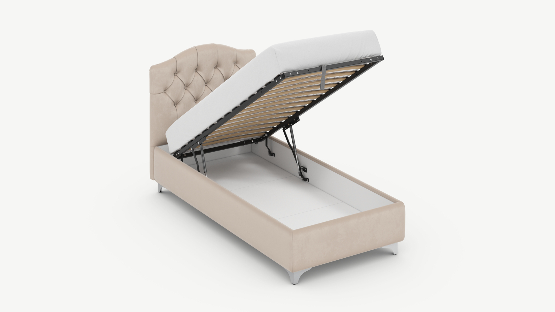 • Скрытая под основанием вместительная емкость без внутренних перегородок позволяет использовать всю площадь подкроватного пространства для хранения вещей.